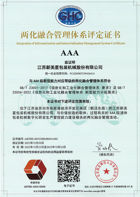 近日,新美星順利通過《信息化和工業化融合管理體系 要求》(GB/T 23001-2017)及《信息化和工業化融合管理體系 新型能力分級要求》(GB/T 23006 -2022)體系認證,成為張家港市第3家獲得AAA級認證的企業。AAA級是目前兩化融合管理體系可申請的最高認證等級。這一權威證書的獲得,標志著新美星信息化與工業化、數字化深度融合工作再上新臺階,有力推動了企業高質量發展。